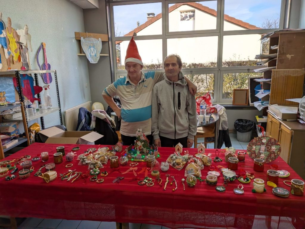 Une dizaine de pensionnaires de L’Escale et La Maisonnée s’étaient mobilisés en amont lors d’un atelier créatif encadré par les professionnels, avec l’aide précieuse de la bénévole Aurélie. Ensemble, ils ont confectionné des créations festives : bijoux de Noël, décorations, porte-clés, friandises et ballotins de gâteaux maison.